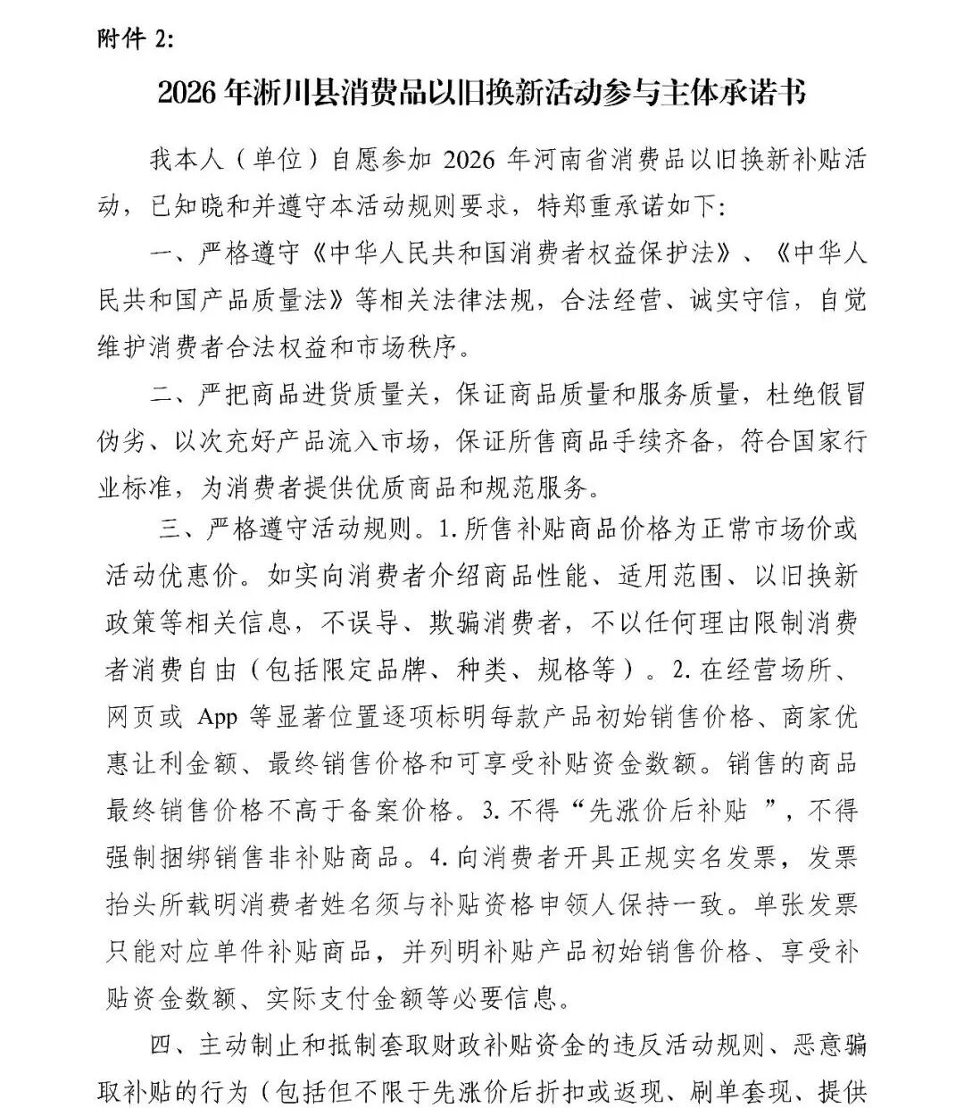 2.2026年淅川县消费品以旧换新活动参与主体承诺书