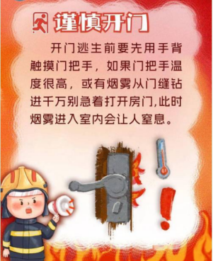 有2个关键动作,缺一不可,一是先摸门的温度,可以摸门的门板或者把手,发烫就不要开门了,直接固守;二是查烟气,其实门不发烫仅代表门外没有明显的高温,这时烟气可能已经蔓延过来了,我们要轻开门缝,先查看是否有烟气,闻有无刺激的气味,是否头晕等,如果发现这些风险应立即关门固守。